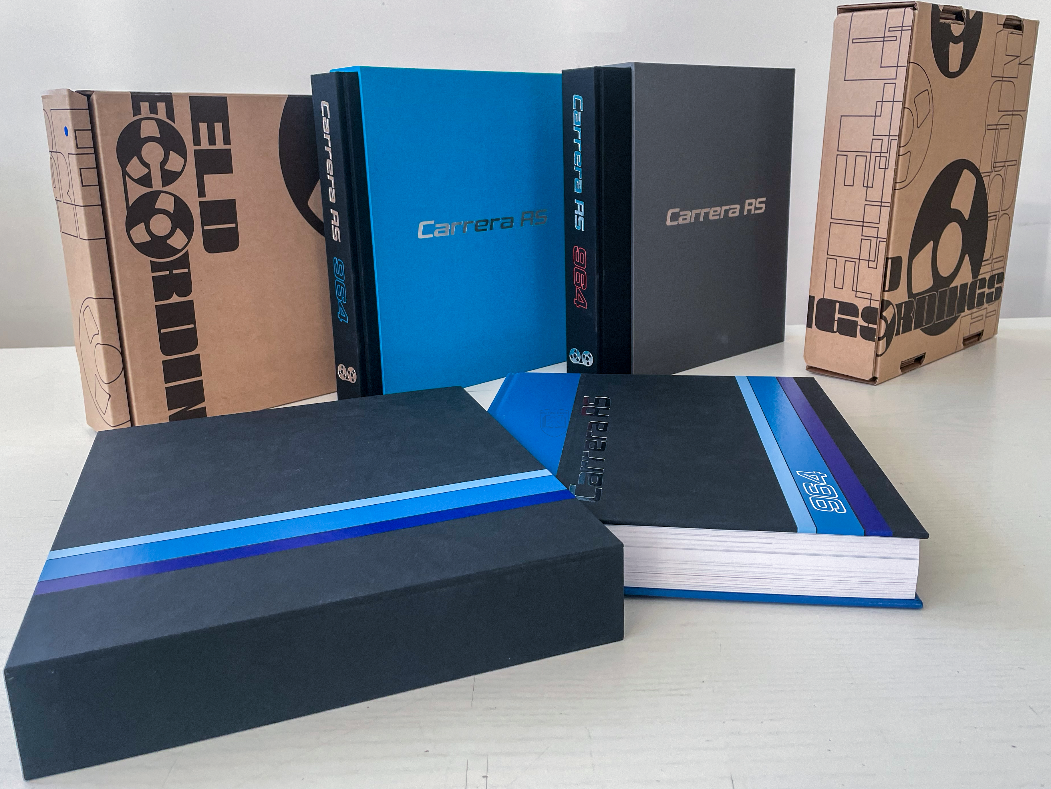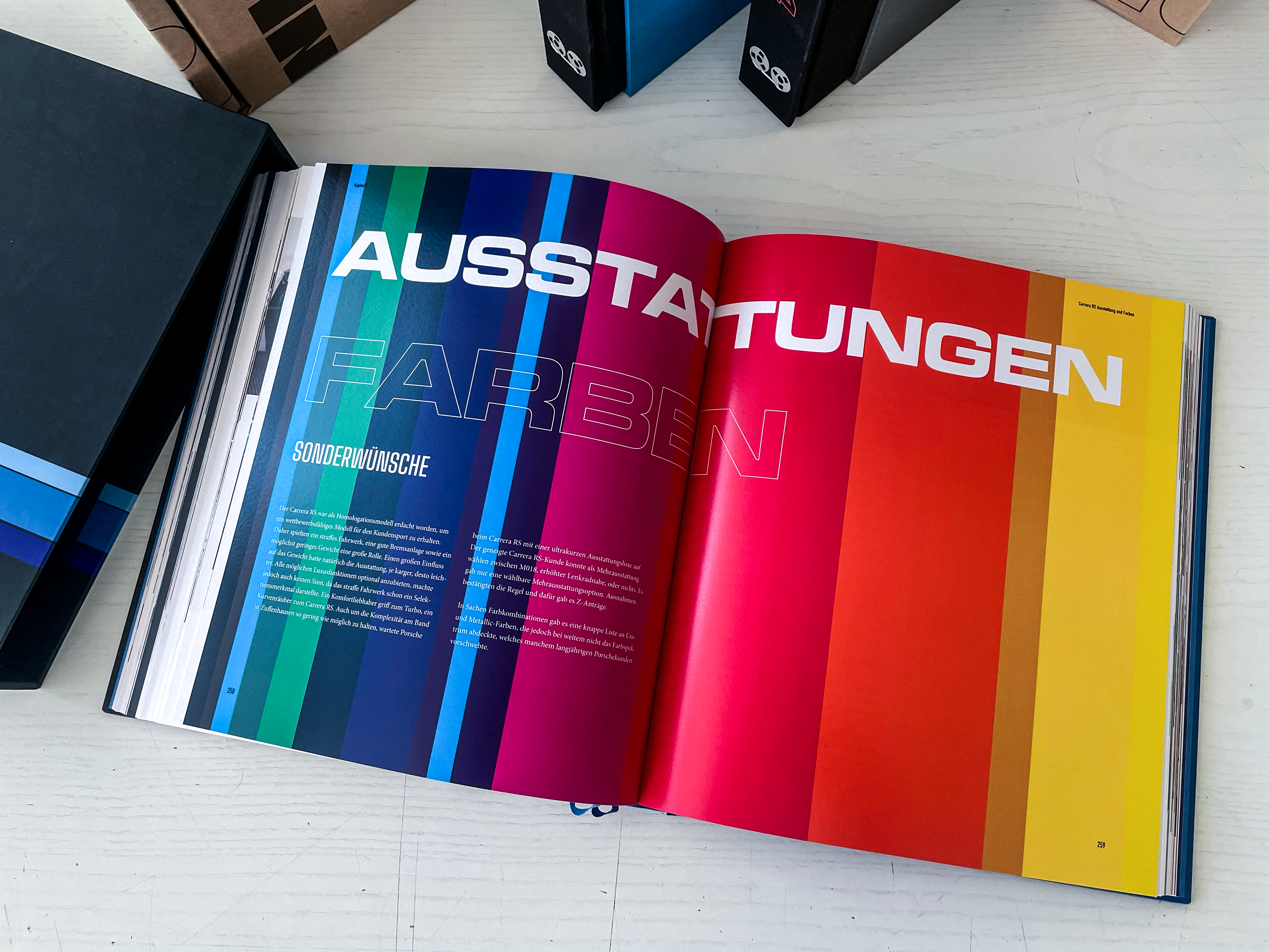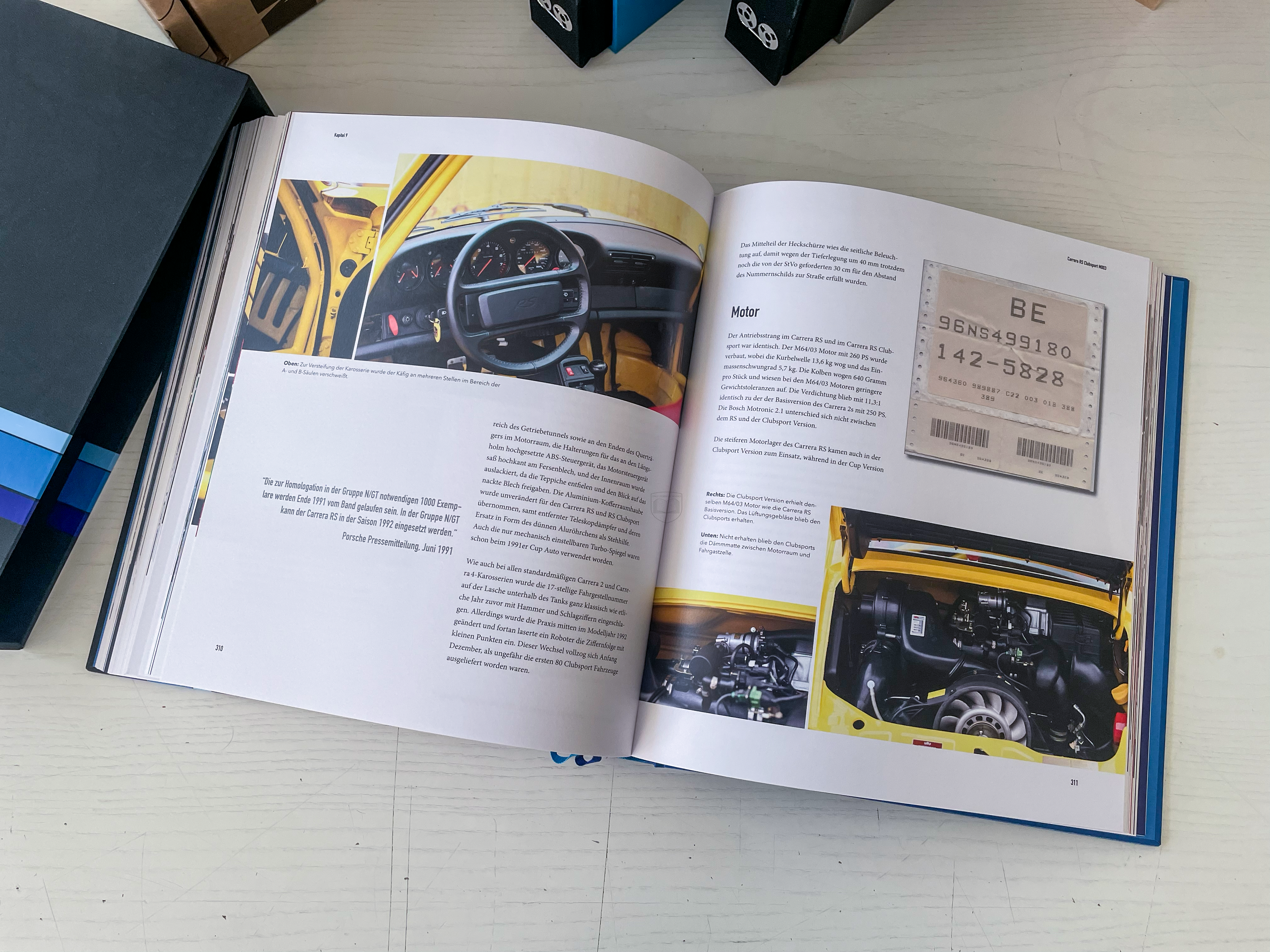 Das gelieferte Buch ist ein besonderes Exemplar: die sogenannte „Farbe-nach-Wahl-Version“, limitiert auf 200 Stück in Perlgrau. Mäder hat sich intensiv Gedanken über die Gestaltung gemacht. Insgesamt existieren sieben verschiedene Varianten des Buches, deren Farbgebung sich an den originalen Bestelloptionen des 964 RS orientiert. Diese Idee entstand im Zuge umfangreicher Recherchen, unter anderem mit Zeitzeugen aus dem Porsche-Mitarbeiterkreis der frühen 1990er-Jahre.